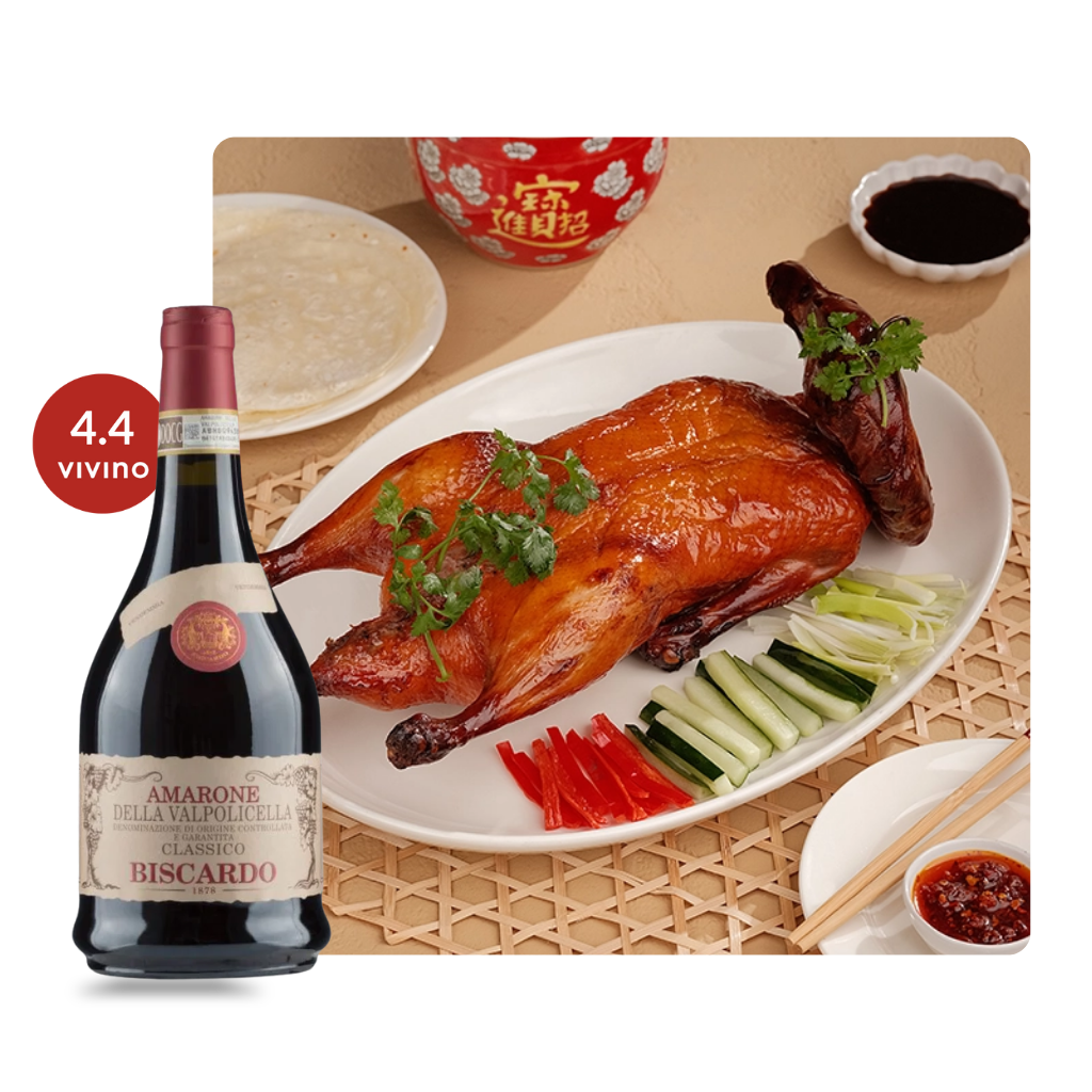 Amarone is made in a style that gives it extra concentration and that signature “dried fruit” richness. This Biscardo shows ripe cherry notes with a velvety texture and a long finish, exactly what duck likes.