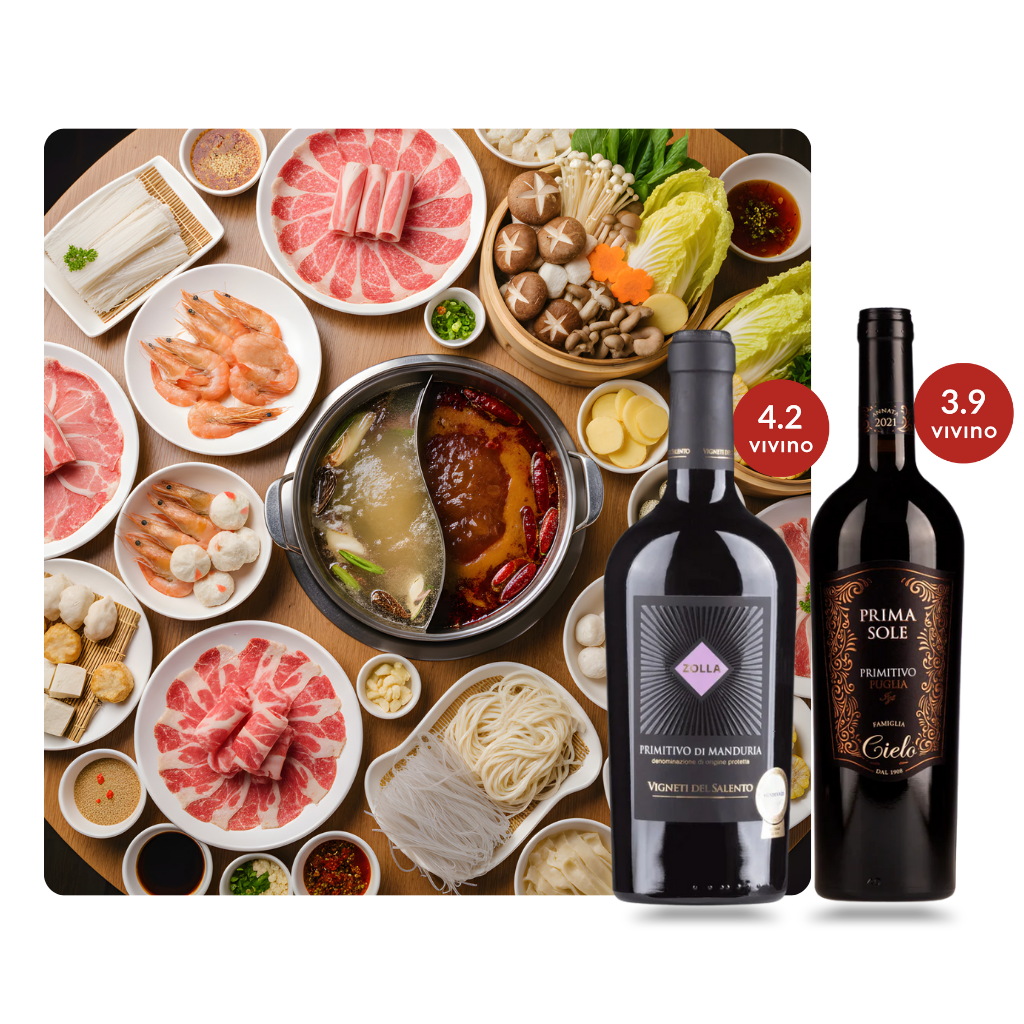 steamboat dinners. Try: Nerone Primitivo - Negroamaro 2023 (LNY Express) or Casa Ermelinda Dona Ermelinda Gran Reserve 2021 (LNY Express)